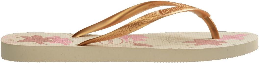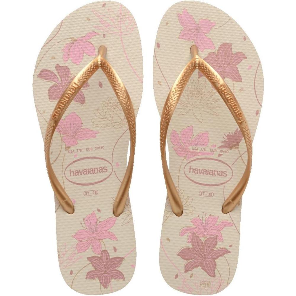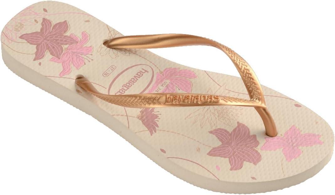“Delicate and romantic, the Havaianas Slim Organic flip-flop is simply one of our most classic models. Slim, with a non-slip thinner sole and straps, this sandal is elevated with the sophistication of metallic-finish straps. With timeless floral prints in a metallic touch, the slipper is available in three colors: choose your favorite. “