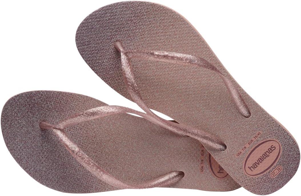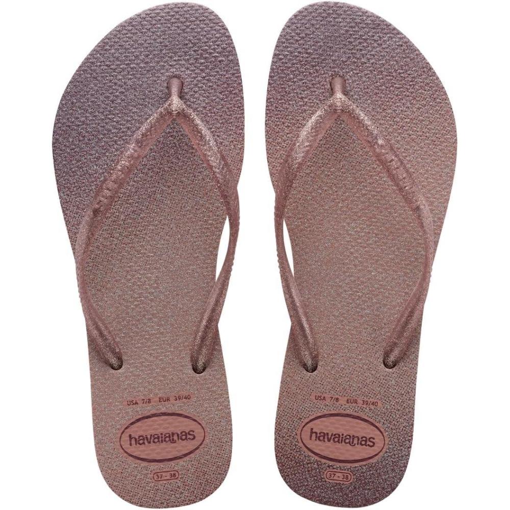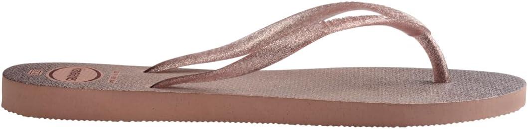 Please note: The molds for the Slim style have changed and no longer include the word “Slim” on the footbed. The Havaianas Slim Gloss Flip Flop Sandal features glitter-covered soles and glitter injected straps. This sandal dazzles at every step. Toe post. Straps for secure fit. Cushioned footbed with textured rice pattern and rubber flip flop sole. Synthetic upper. Rubber lining, insole and outsole. Made in Brazil.